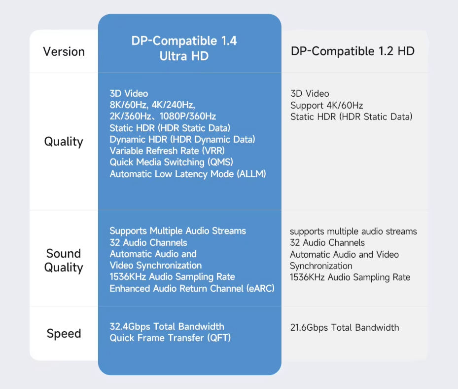 DisplayPort 1.4 – Mais Velocidade e Qualidade: Compatível com DP 1.4 Ultra HD, oferece suporte a 8K@60Hz, 4K@240Hz e até 32.4Gbps de largura de banda, garantindo imagens extremamente nítidas e fluidas: