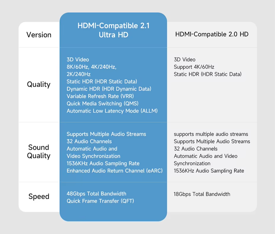 HDMI 2.1: Imagem e Som Superiores: Oferece qualidade ultra HD com 8K/60Hz, som aprimorado com 32 canais e taxa de transferência de até 48Gbps — muito além da versão 2.0:
