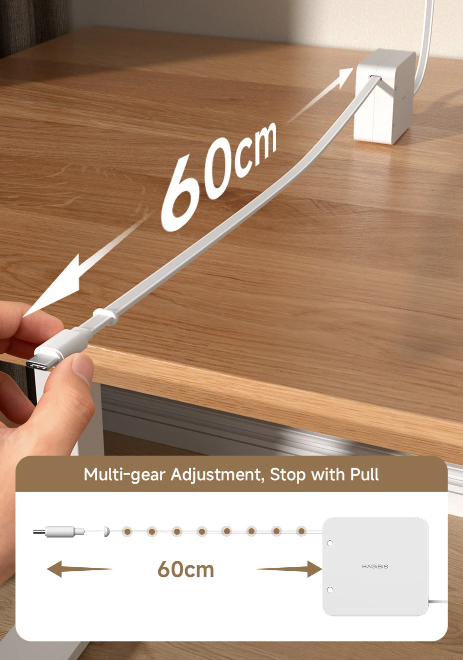 Extensão Retrátil Inteligente: Puxe para carregar e solte para recolher, com até 60 cm de ajuste suave que mantém sua mesa organizada e sem enrolar cabos: