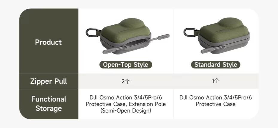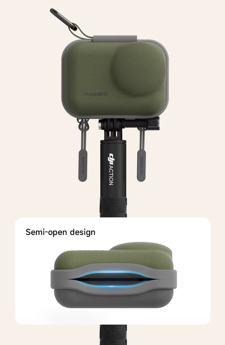 Design Semiaberto Inteligente: Armazene sua DJI Osmo Action com o bastão de selfie acoplado, sem precisar desmontar: