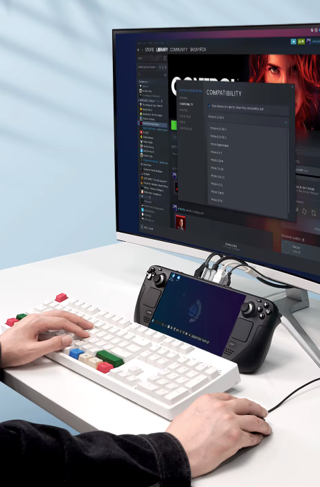 Fácil Conexão: Conecte seu Steam Deck sem a necessidade de cabos adicionais. O design portátil permite fácil conexão e sem ocupar muito espaço: