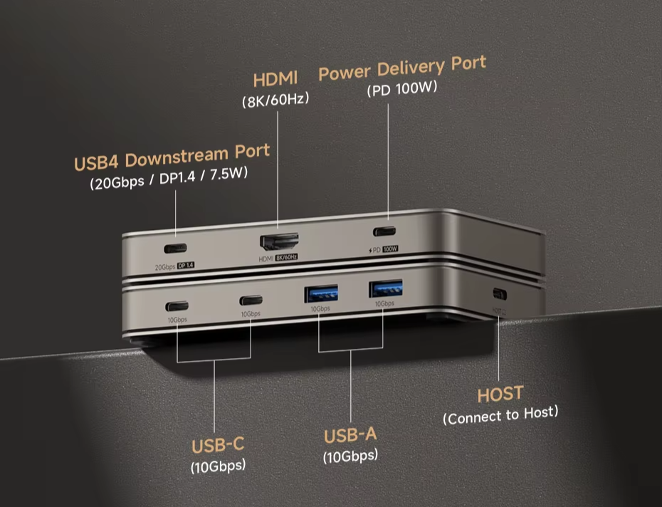 Conectividade Avançada em um Único Hub: Múltiplas portas de alta velocidade com USB4, HDMI 8K/60Hz, USB-C e USB-A para dados, vídeo e energia: