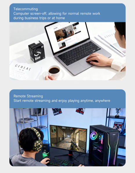 Streaming remoto sem monitor ligado: Trabalhe ou jogue remotamente mesmo com a tela desligada. Ideal para home office ou games, com conexão estável e fluida em qualquer lugar:
