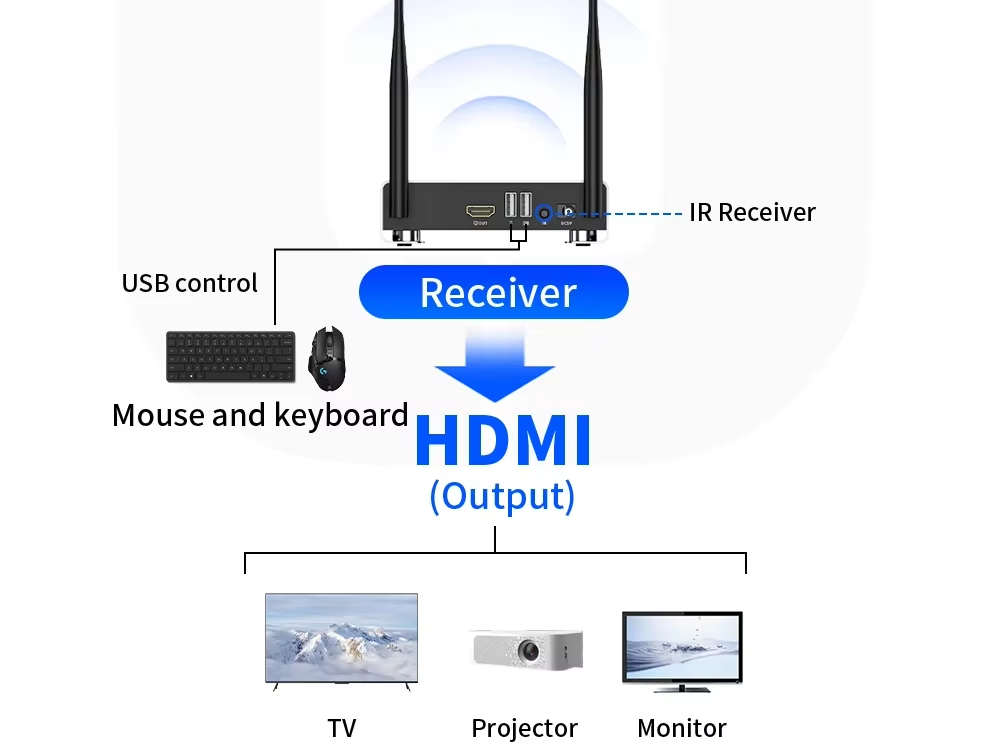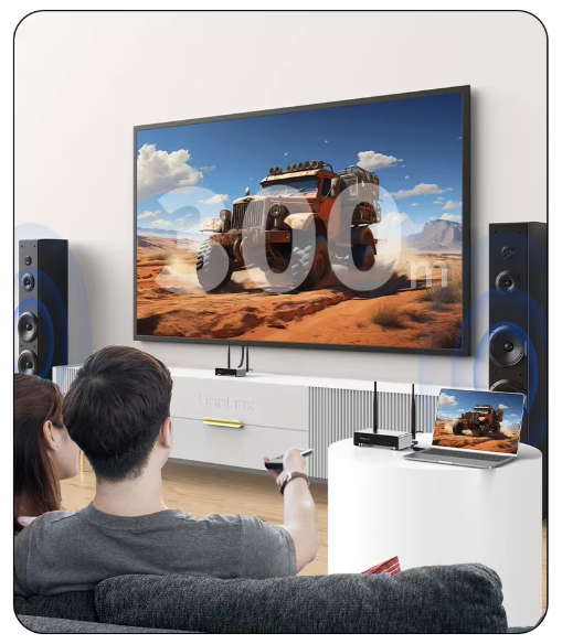 Sinal HDMI Sem Fio até 300m: Transmissão estável e profissional, conectando 1 transmissor a até 8 receptores — tudo sem cabos: