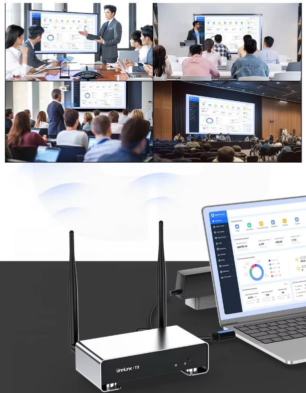 Apresentações Simultâneas Sem Limites: Um único transmissor envia o conteúdo para vários receptores ao mesmo tempo, perfeito para salas de aula, reuniões e grandes conferências: