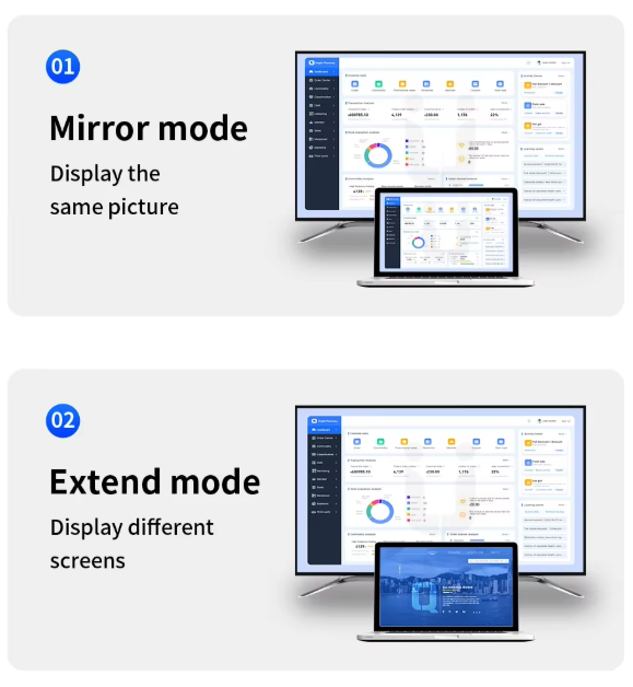 Dois Modos de Exibição: Espelhamento para apresentar o mesmo conteúdo e extensão para usar telas diferentes ao mesmo tempo:
