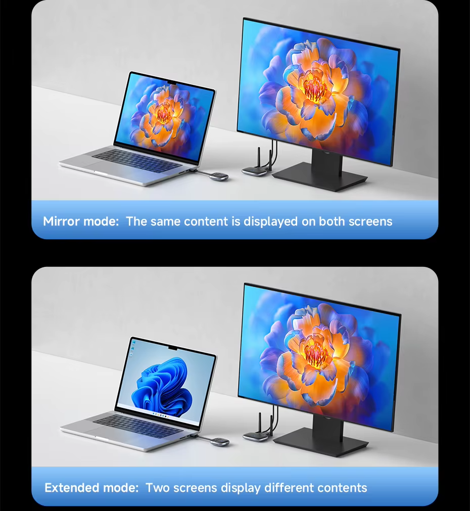 Modos Espelho e Estendido: Escolha entre duplicar a tela (Espelho) ou ampliar sua área de trabalho (Estendido), exibindo conteúdos diferentes em cada monitor: