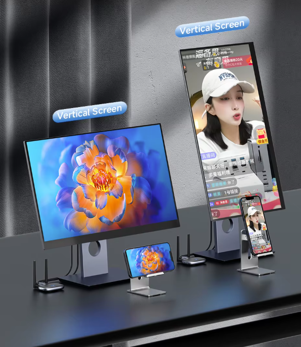 Tela Horizontal e Vertical: Alterne facilmente entre modo horizontal e vertical com um clique. Ideal para trabalho e reuniões (horizontal) ou vídeos e lives (vertical). Compatível com o modo de transmissão por software: