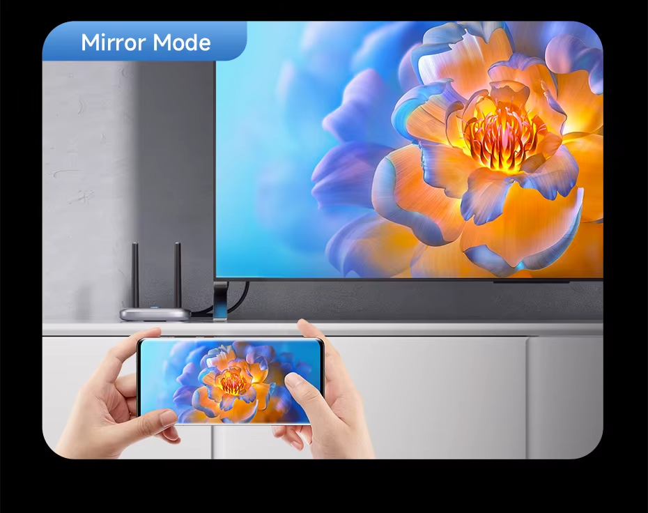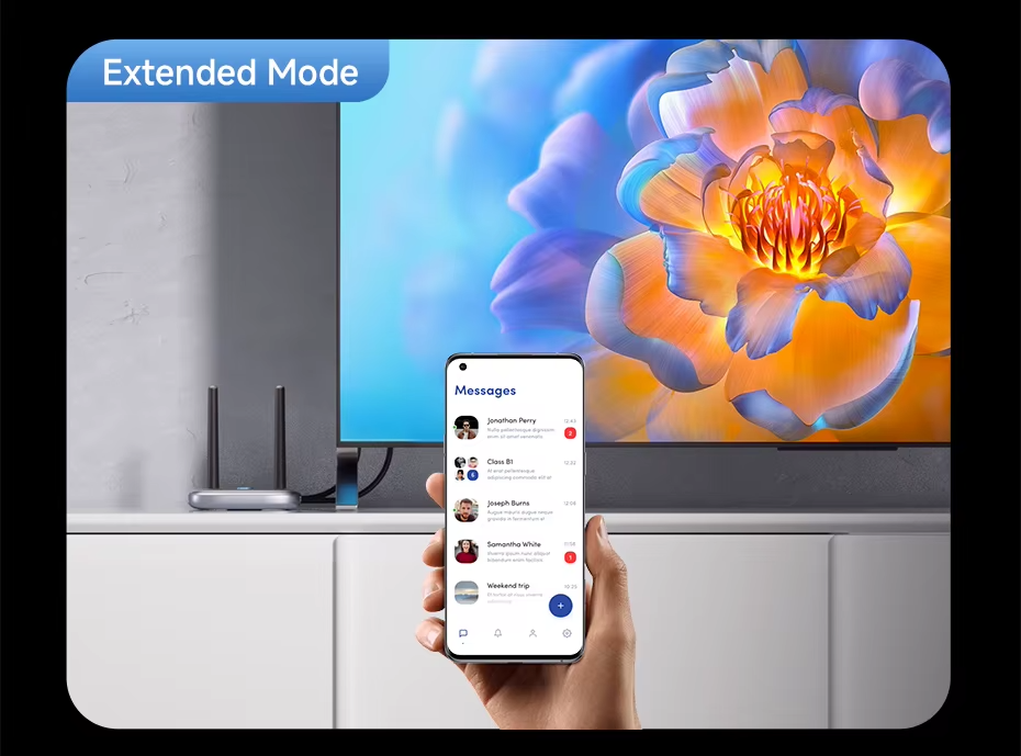 AirPlay com um Toque: Controle seu celular enquanto espelha ou estende a tela na TV. Compatível com os modos Espelho e Estendido para maior flexibilidade: