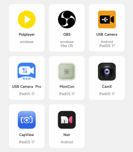 Compatível com Diversos Softwares: Funciona com Potplayer, OBS, MoniCon, USB Camera e outros apps populares, garantindo ampla compatibilidade em Windows, macOS, Android e iPadOS: