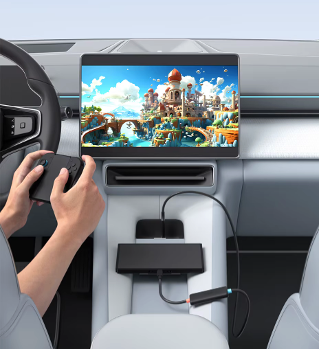 Switch no Sistema do Carro: Aproveite jogos em tela grande conectando o console ao display do veículo, ideal para momentos de pausa durante viagens: