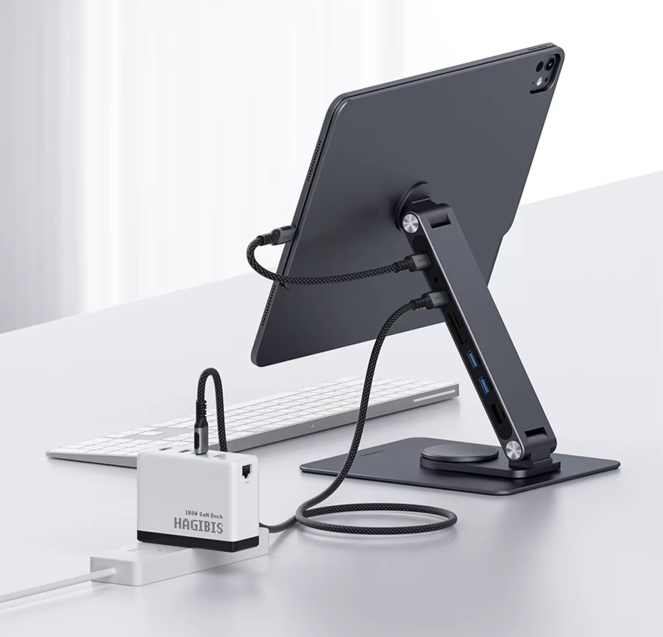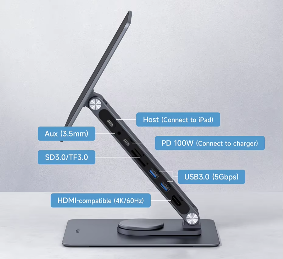 Dock Integrado com 8 Portas: Transforme seu iPad em uma verdadeira estação de trabalho. O dock embutido oferece 8 portas de expansão para carregamento rápido, tela externa em 4K/60Hz, teclado, mouse, áudio e muito mais: