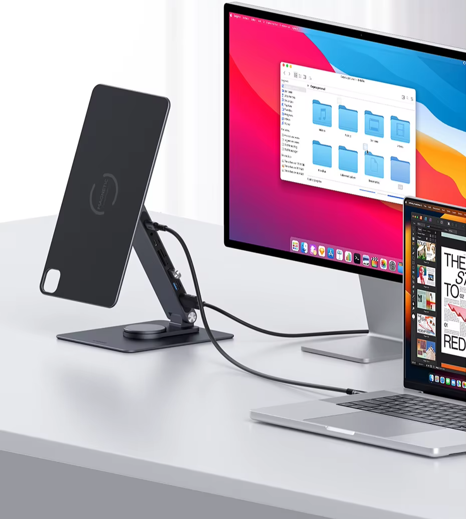 É Suporte e Também Docking Station: Funciona como suporte magnético ajustável e estação de conexão completa em um único produto: